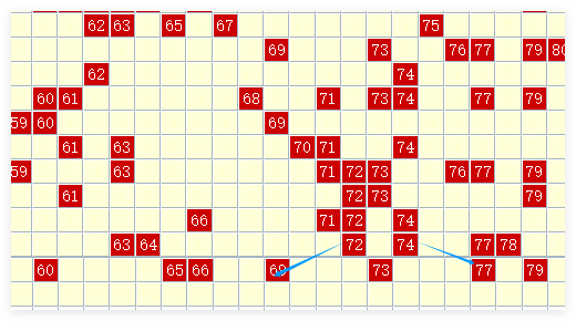 第四区(61-80):开出6个奖号(63、64、72、74、77、78),2个奇数,4个偶数。最近5期该区开出14个奇数号码和12个偶数,走势相对平衡。下期看好该区升温,预计开出8个奖号,关注奇数63、65、67、73,偶数62、68、74、76。