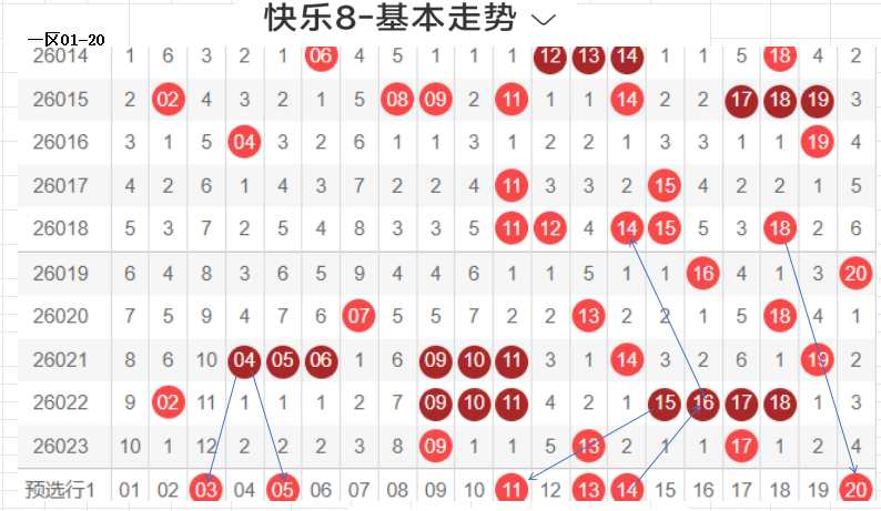 二区(21-40):遗漏5期以下有17个,0码27 28 31 36 39 5个,数据所示,冷码平均,选择条件增多了.上期开出了5个号码,出码比较分散.这期布防相应增加,重码按比例落这区较少,先给出关联码26,这个区间间接走势,温区,21-30区间上期开了2个,依旧不是重点选号区间,31-40区间开出3个,本期关注热码的回补,间隔小遗漏值最佳,3字头转热,这个小区热码注意回调,可以做关联码的布局,注重温冷码的回补.