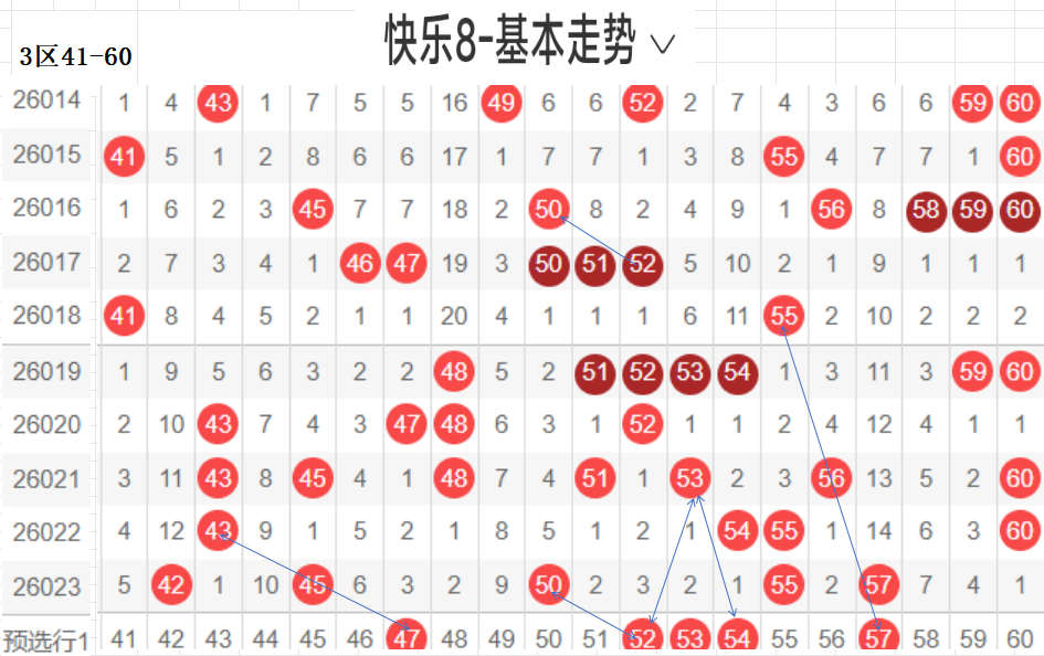 三区(41-60):遗漏5期以下有16码,0码42 45 50 55 57 5个,温开方式,这区码数有回暖之意,可以防一手,先定胆码走势较大者,隔期,斜三连,分边号码,可重防,间隔5期以上号码可以随走势选取,例如本期大冷码,走势比较大,可以做胆,通常联动可带出,分边对称的号码,本区间也有很大走势.可关注下.隐形夹角号码.做补位形态号码.都需要观察动态走势.以上是本区间的选码方法.