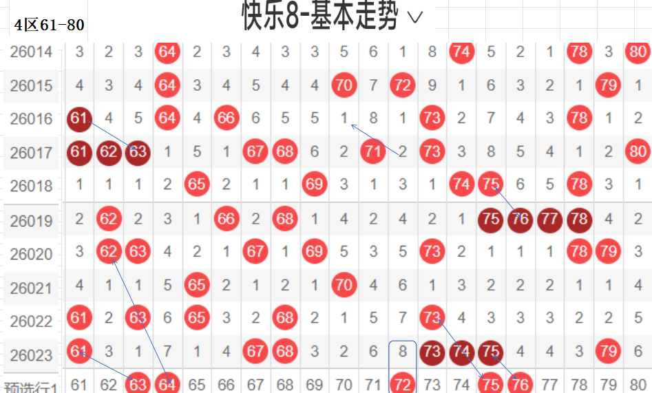 四区:(61-80):遗漏5期(含5)以下有17码,0码61 67 68 73 74 75 79 7个,平均温开方式,上期开出7码,区间回暖,后区可防,四区间从以往数据来看,重码很强,一枝独秀的存在,近期有回补走热的趋势,区间回暖后,本区间后区可防,与一区相比,也是温区.,对称下落码,隔期回补码,可以防守,这区对呈对称三角关系的胆码,斜三连有走势的胆码,联动落位码,都有各自的走向落位关系,根据走势选择一种方式选码.