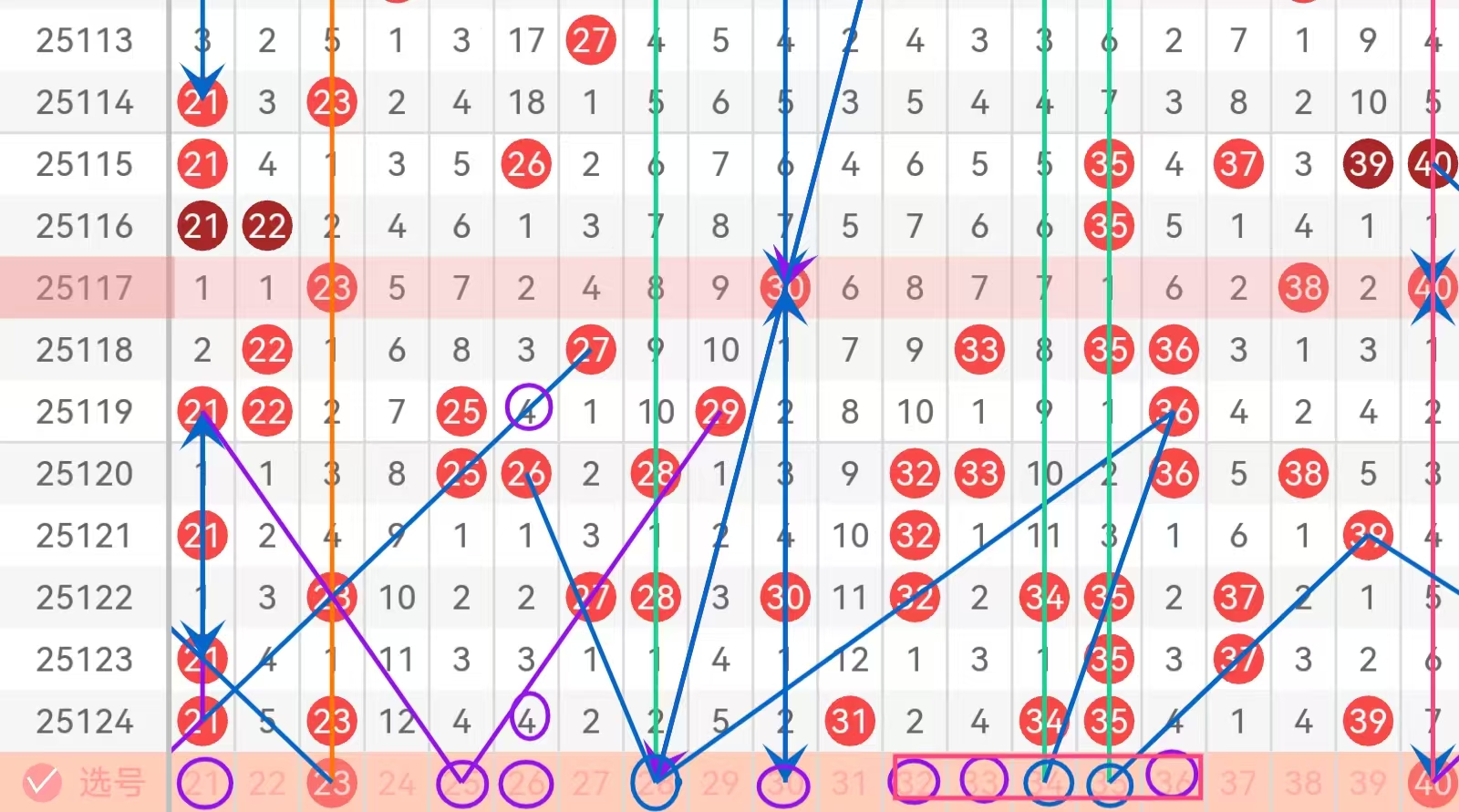 二区间推荐主做号码:21 23 30 32 33 36 40;防守号码:22 25 26 28 34 35 38;