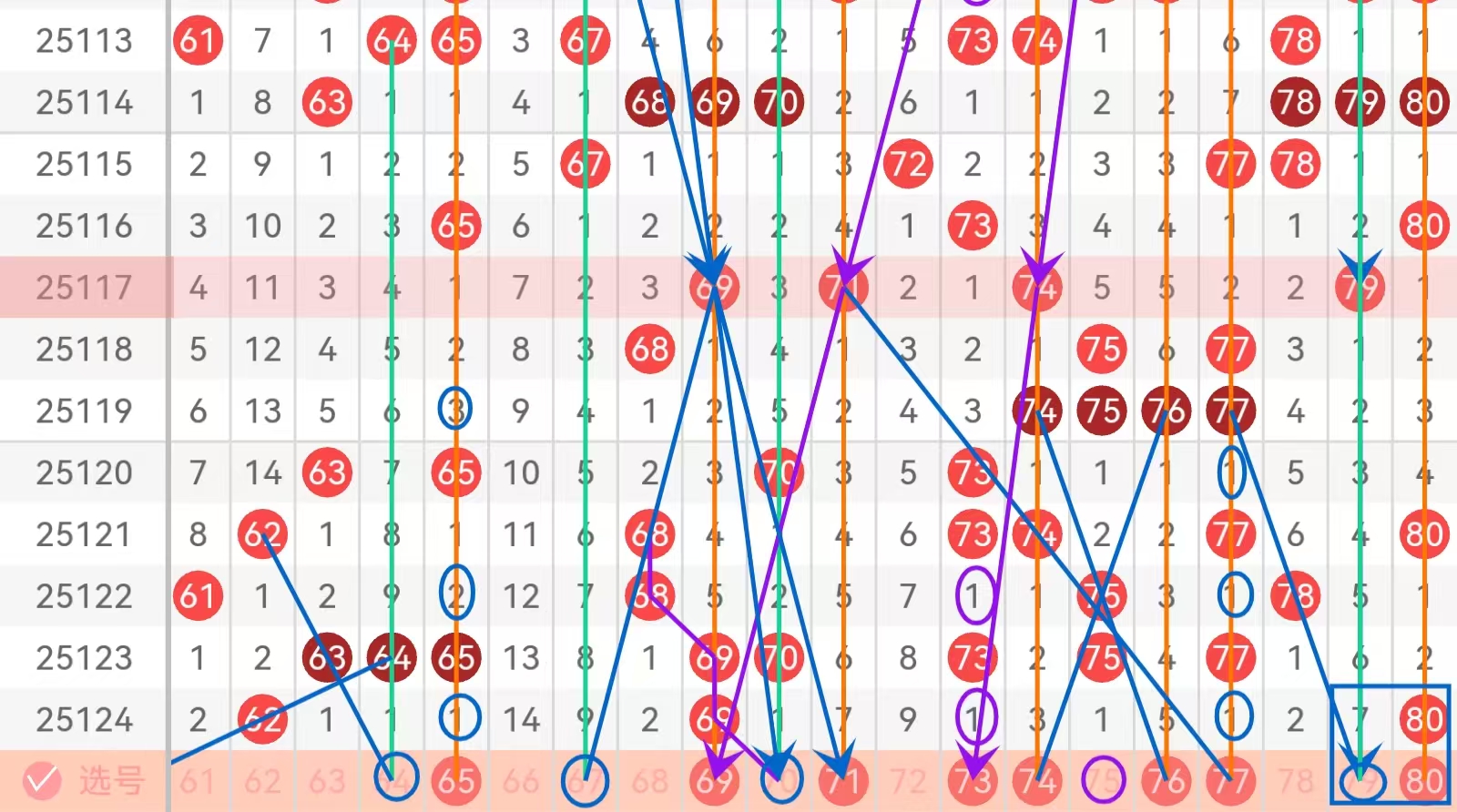 四区间给到主做号码球61 65 69 71 74 77 80;防守号码球:64 67 70 75 79;