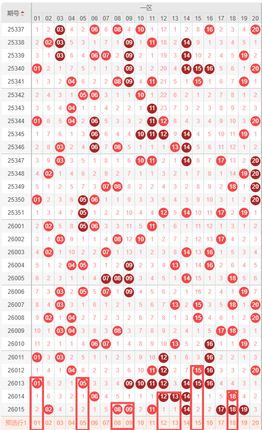 一区:最近一区10期出号情况为:5 5 4 5 5 4 6 9 5 8,总出号情况为56个,平均出号5.6个,本期一区号码推荐出号为:01 05 08 09 12 13 15 18。重点关注:01 05 08 13 15。