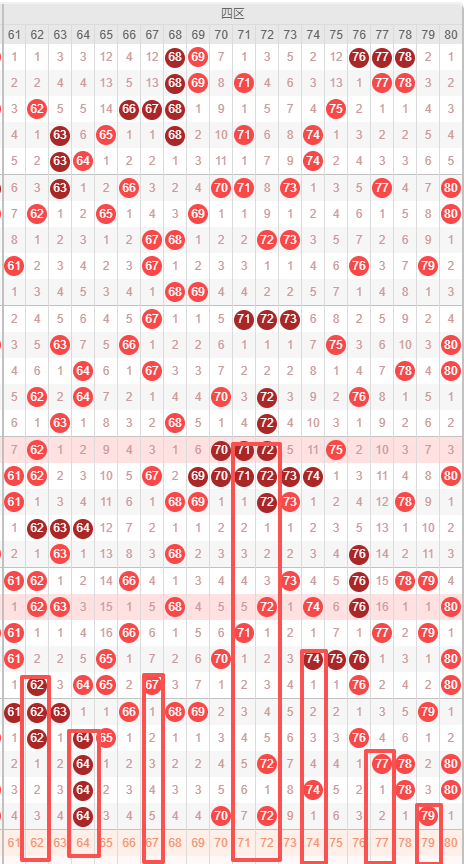 四区:最近四区10期出号情况为:7 7 5 7 6 7 4 5 4 4,总出号情况为56个,平均出号5.6个,本期四区号码推荐:62 64 67 71 72 74 77 79,重点关注:64 74 77 79。