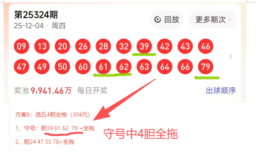 首先看上期开奖号码:09 13 20 26 28 32 39 42 43 46 47 49 50 60 61 62 63 64 66 79,上期守号命中4胆全拖一注