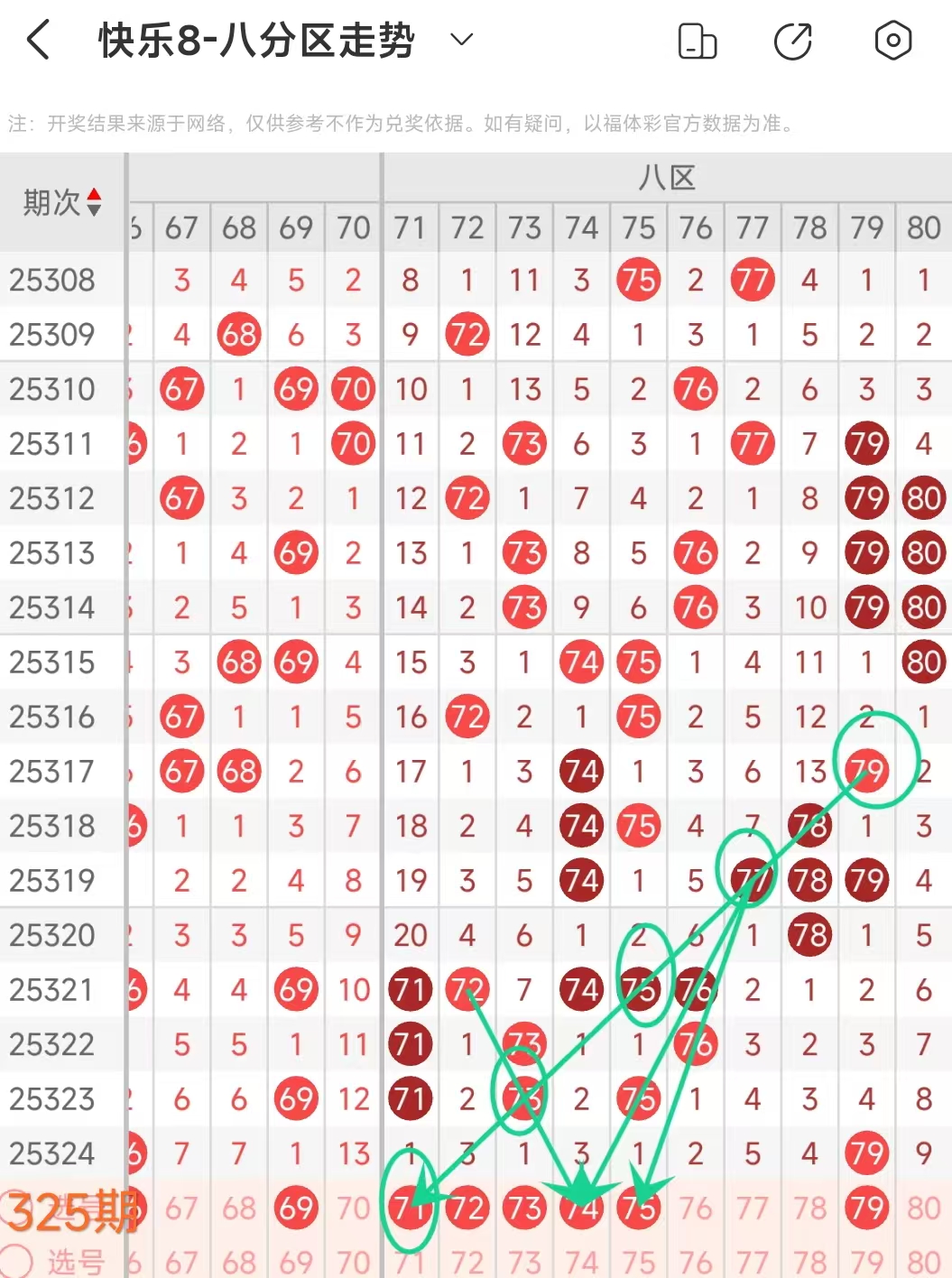 在快乐8的探索之旅中,通过对开奖走势图细致入微的观察,我们总结出一些具有参考价值的规律。几乎每一期开奖号码都呈现出以下显著特征:其一,大概率出现连号;其二,常常伴有边码;其三,遗漏值为1 2 3的号码频繁现身;其四,重号现象也较为常见。掌握这些要点,能为我们的投注提供方向指引。我们约定采用八分区走势图来展开分析。