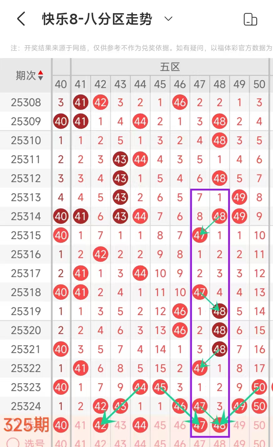 上期五区开42 43 46 47 49 50 这6个号码,本期该区应该出号4个左右