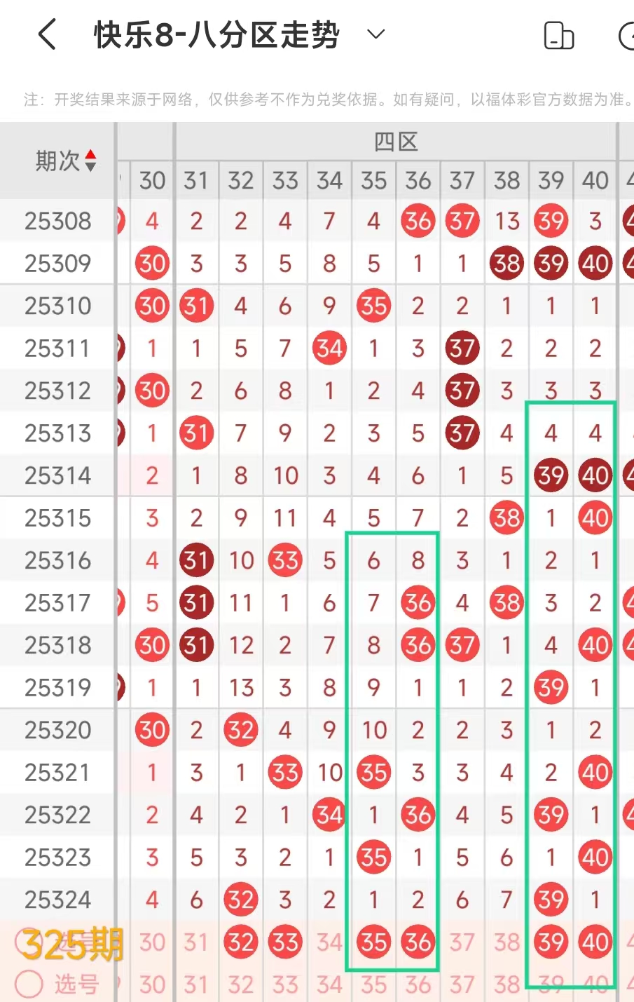 上期四区开出32 39这2个号码,本期考虑2个左右。