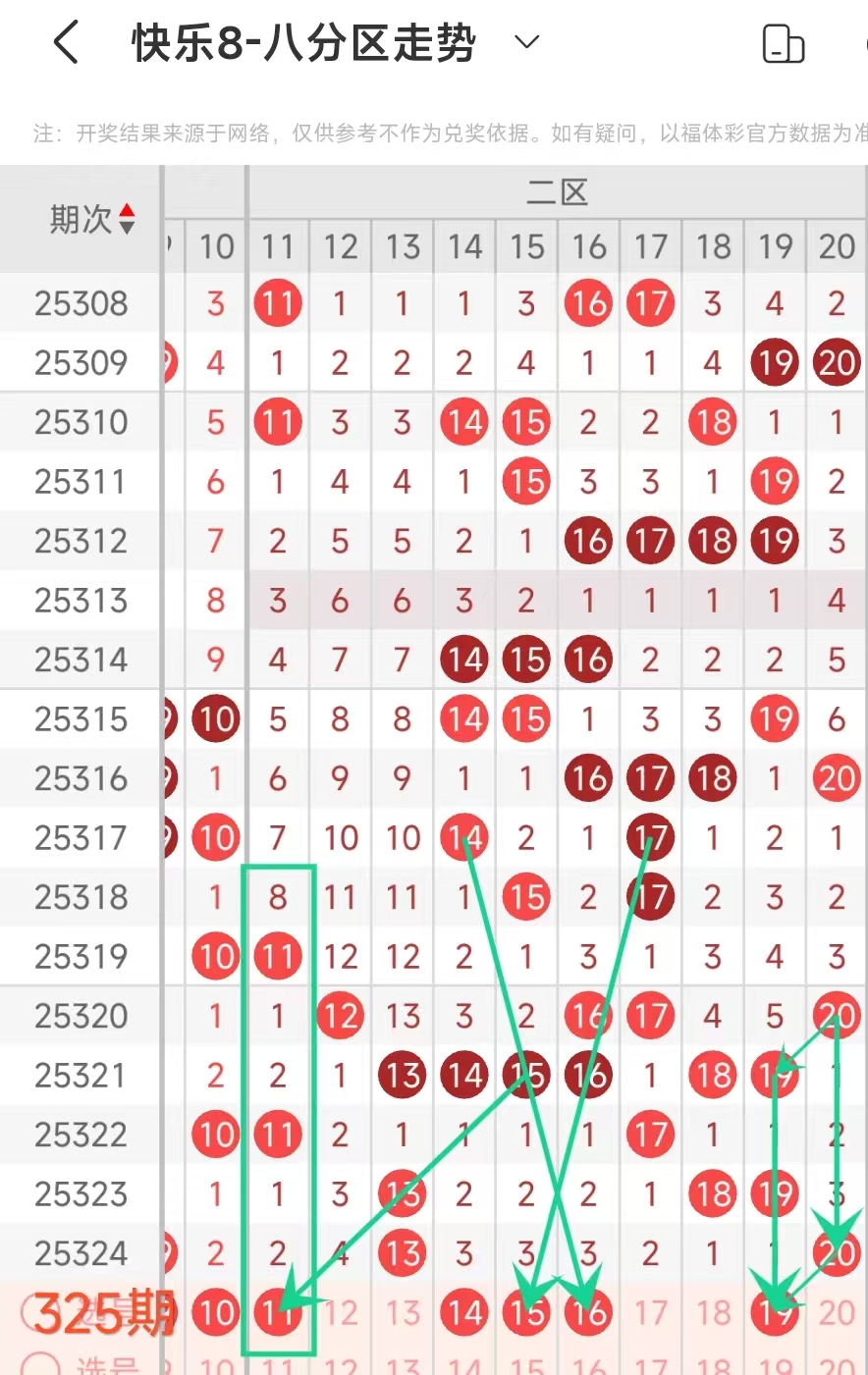 上期二区开出 13 20 这2个号码,本期应该出3个左右。