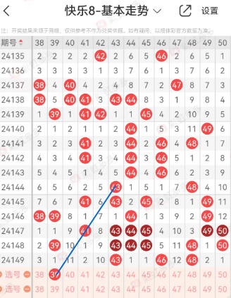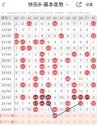 39码,遗漏间隔为6.1.1,形态为ABB。且如上图所示,与往期奖号41 43码形成一个隔2的斜3连,所以看好。