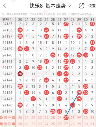 27码,遗漏间隔为1.2.5,邻近上期奖号26码,且如上图所示,与往期奖号28 29码形成一个隔1的斜3连,所以看好。