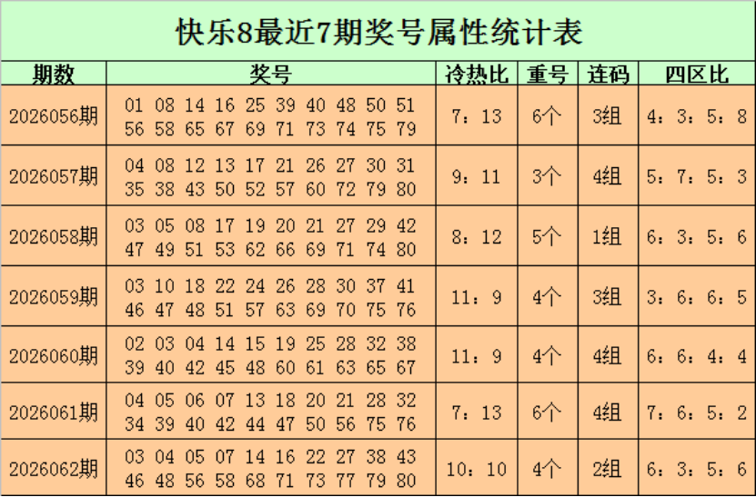 福彩快乐82026062期开奖回顾:03 04 05 07 14 16 22 27 38 43 46 48 56 58 68 71 73 77 79 80,其中奖号冷热比为1010,开出4个重号:04050756,四区比为6356