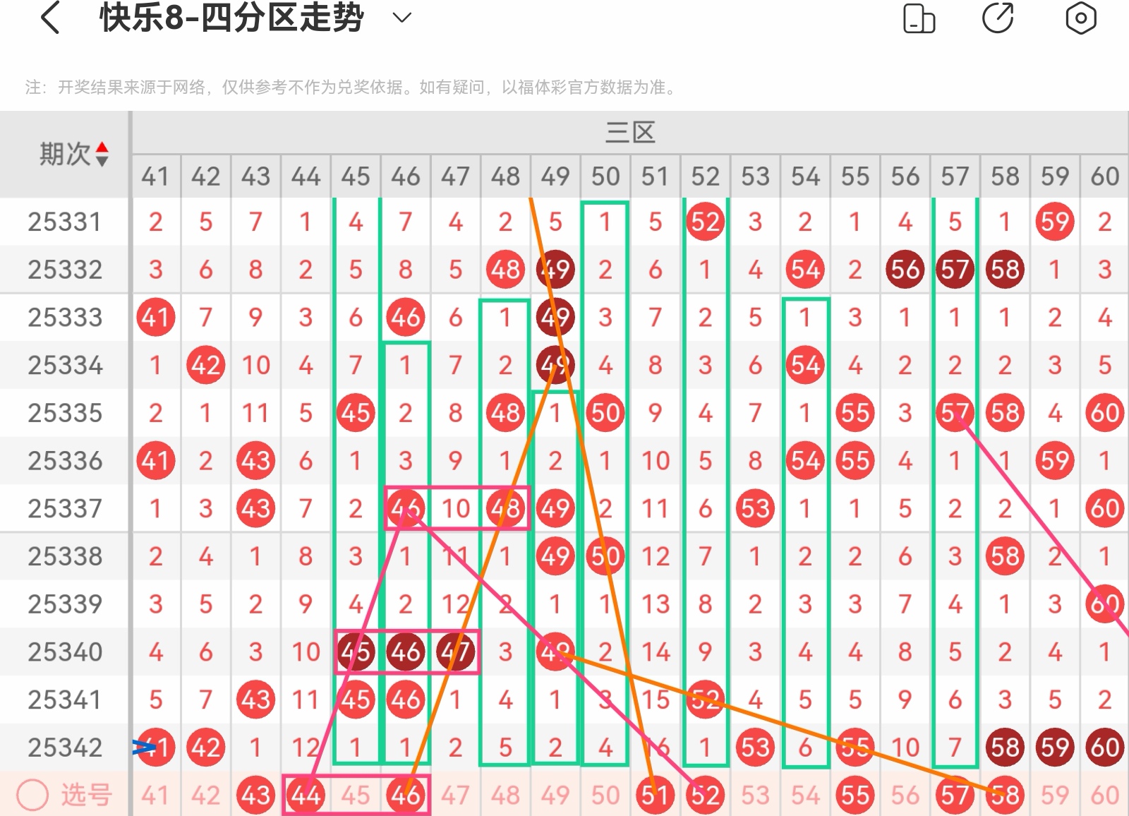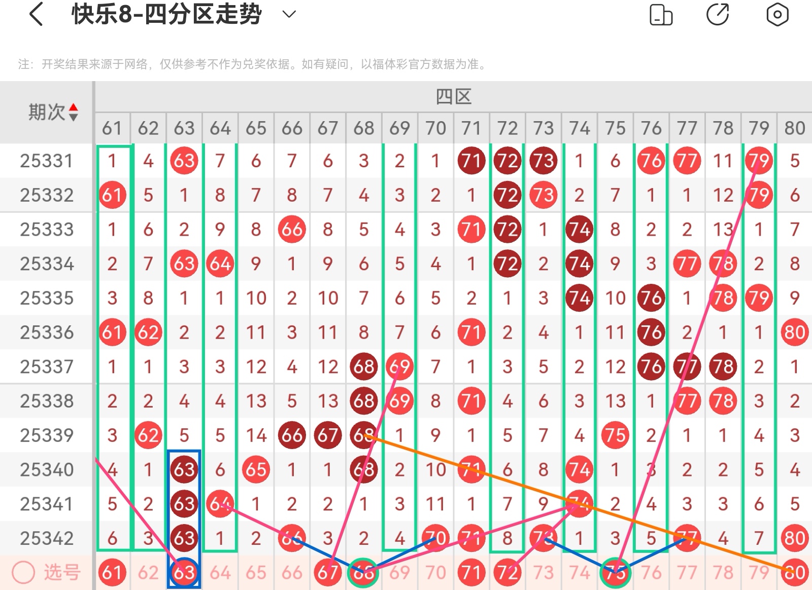 大家好,我是甜丝丝的坏事,主要以快乐八的形态走势、空位走势、遗漏走势以及斜连走势相结合的方法,用公认的四分区走势来进行预测分析,希望能让你有所收获。