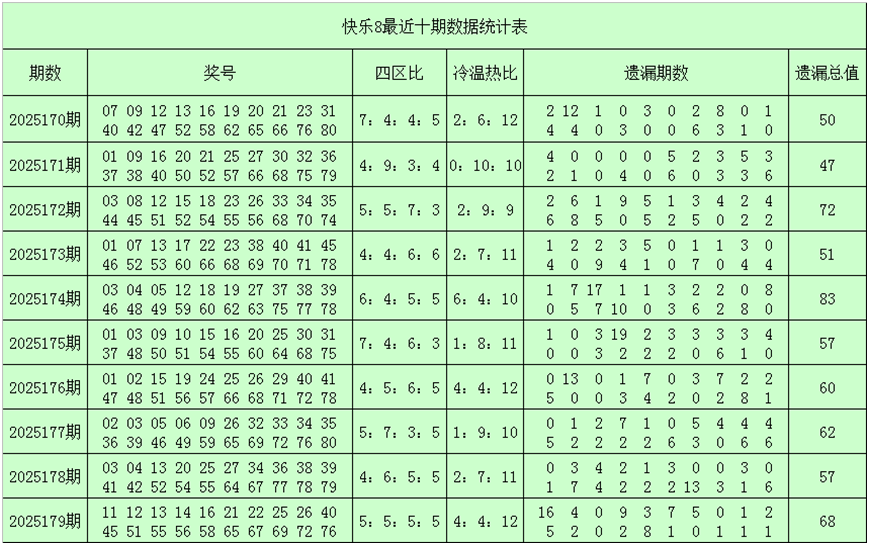 一、快乐8第2025180期奖号分析(定义:遗漏0-2期号码为热码,遗漏3-6期号码为温码,遗漏7期及7期以上号码为冷码,重码为上期开出奖号,邻码为上期没有出现,但与上期奖号差值为1的号码,例如上期开出奖号04,没有出现号码03和05,则本期03和05都为邻码,其它则为孤码。