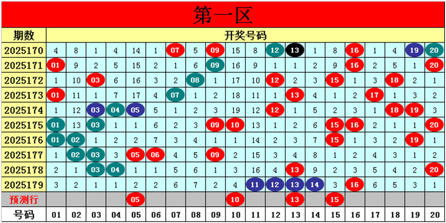 目前第一区包含12个热码:重码5个11、12、13、14、16,邻码1个20,孤码6个02、03、04、05、06、09;包含7个温码:邻码3个10、15、17,孤码4个01、07、18、19;包含1个冷码:邻码0个,孤码1个08;号码冷温热个数比为1:7:12,重号、邻码、孤码个数比为5:4:11。