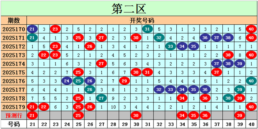 目前第二区包含13个热码:重码5个21、22、25、26、40,邻码2个27、39,孤码6个32、33、34、35、36、38;包含6个温码:邻码2个23、24,孤码4个29、30、31、37;包含1个冷码:邻码0个,孤码1个28;号码冷温热个数比为1:6:13,重号、邻码、孤码个数比为5:4:11。