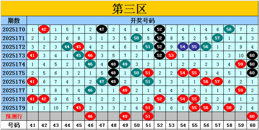目前第三区包含12个热码:重码5个45、51、55、56、58,邻码5个41、46、52、54、59,孤码2个42、49;包含6个温码:邻码2个50、57,孤码4个47、48、53、60;包含2个冷码:邻码1个44,孤码1个43;号码冷温热个数比为2:6:12,重号、邻码、孤码个数比为5:8:7。