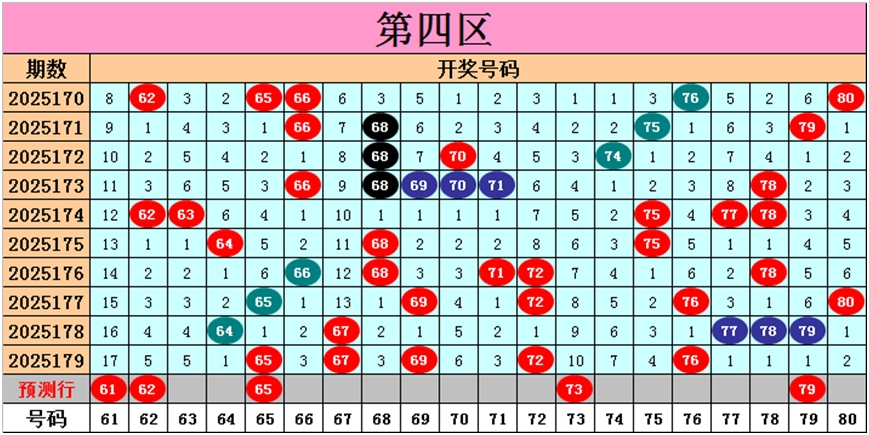 目前第四区包含10个热码:重码5个65、67、69、72、76,邻码2个64、77,孤码3个78、79、80;包含7个温码:邻码5个66、68、70、71、75,孤码2个62、63;包含3个冷码:邻码1个73,孤码2个61、74;号码冷温热个数比为3:7:10,重号、邻码、孤码个数比为5:8:7。