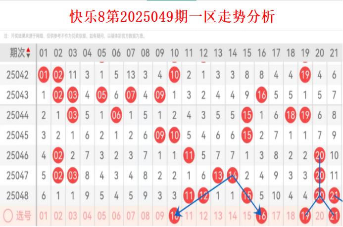 本期一区1字头我们只考虑一个斜连号的10,另外16作为斜连号也要防范,另外19和21是20三楼的分边号码,也是必出的二选一。