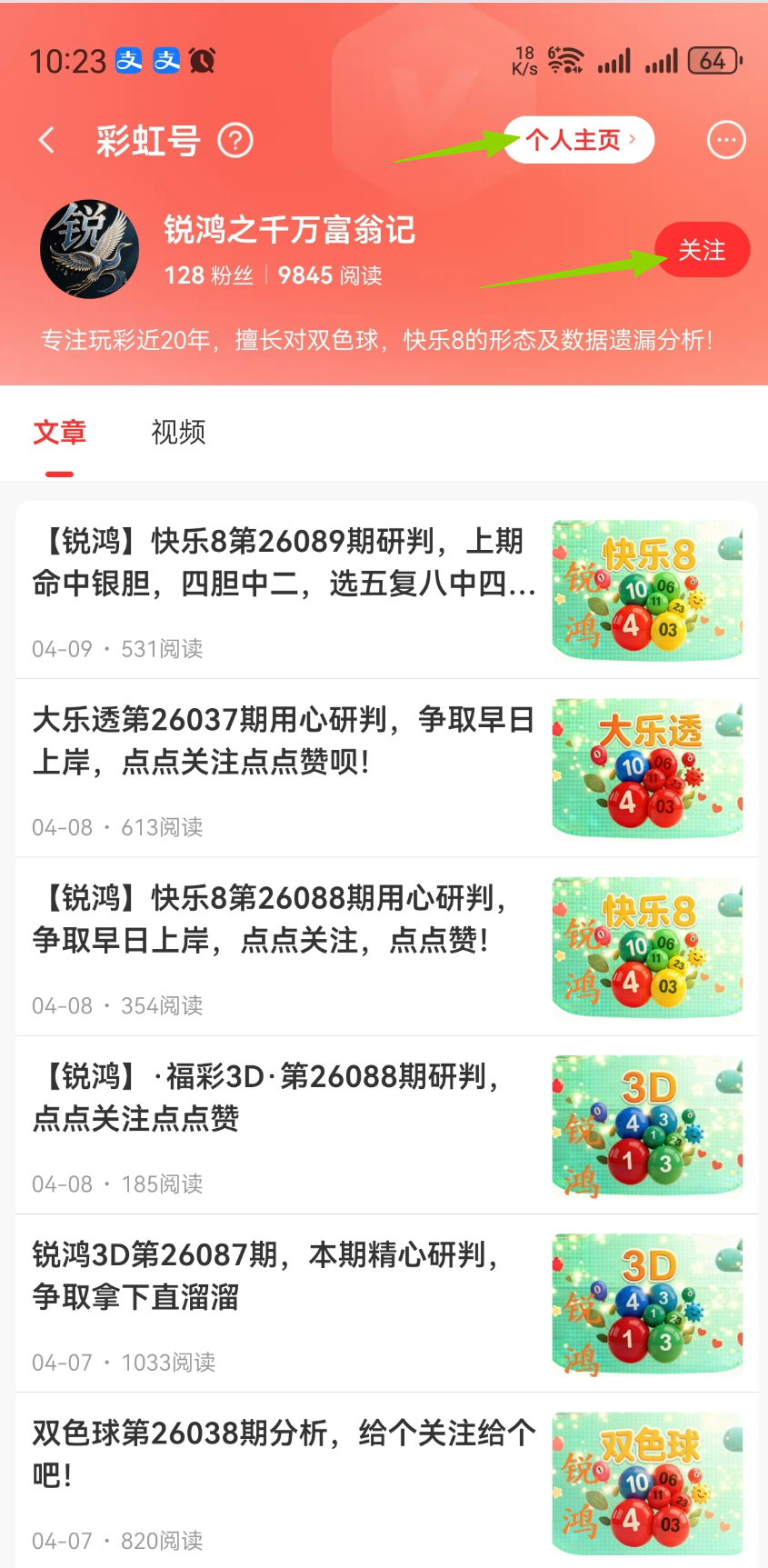 大家好,我是锐鸿,时光飞逝,接触了彩票,到现在已经近20年。这二十年,我换过几十种选号策略,最终整理出多年的思路和经验,相信能为我、为大家带来收获,带来帮助.我每天都在用心写文章,只为你的一个赞赞,一个关注,希望大家能在这里一起成长,一起向那一个小目标迈进,收获多多,早日上岸!