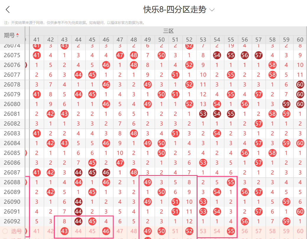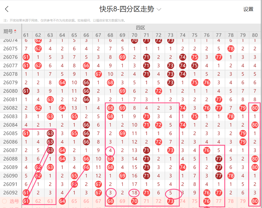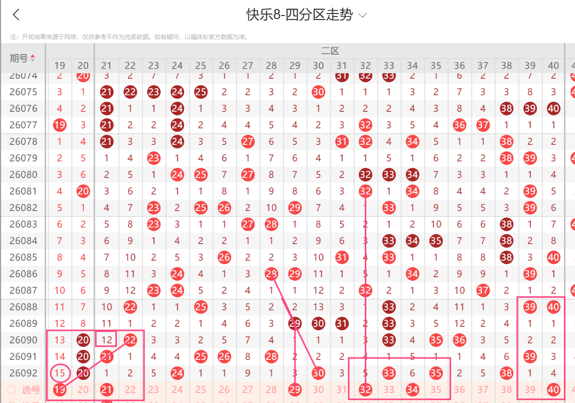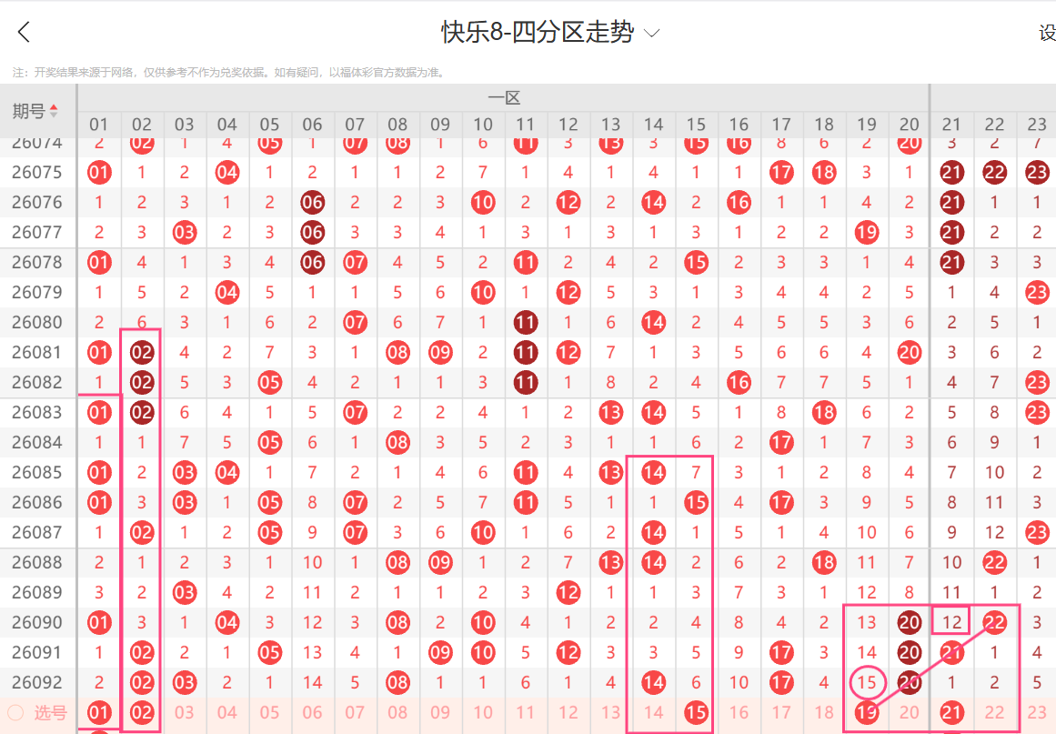 综上分析:快乐八第26093期走势遗漏形态分析,本期大底和区间胆码如下: