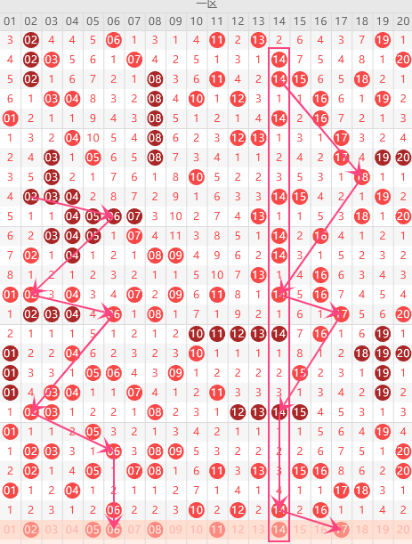 第一区间的走势分析:第一区间上期开出了5个号码球,属于前半区2个,后半区3个码。根据一区间的走势规律,今天的一区间我们主看14属于热码的走势形态再看2号胆回补,可重点关注8号位。个号球重点关注2-8-14的组合