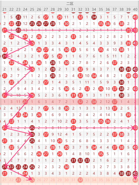 第二区间的走势分析:第二区间上期开出了5个号码球,前半区2个,后半区3个,根据二区间的走势规律,今天的二区间我们主看半区40,再看二区间后区位置21这个号码球的落位,重点关注23-25-40组合