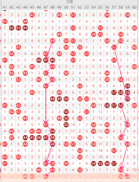 第三区间的走势分析:第三区间上期开出了4个号码球,属于前半区2个,后半区2个码。走出了4的形态走势,,根据三区间的走势规律,今天的三区间我们主看半区位置48组合的落位,48走出了连期对称的走势,重点关注47-59组合这个号码球的落位