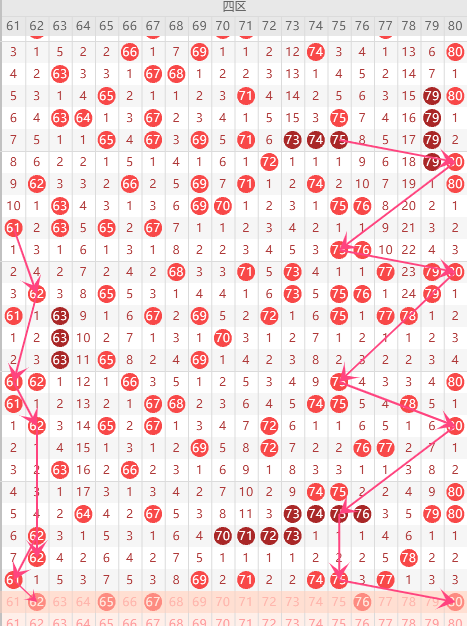 第四区间(61-80)第四区间的走势分析:第四区间上期开出了6个号码球,,根据四区间的走势规律,今天的四区间我们主看半区61这个号码球的落位,根据以往61的落球规律。重点关注62-80组合