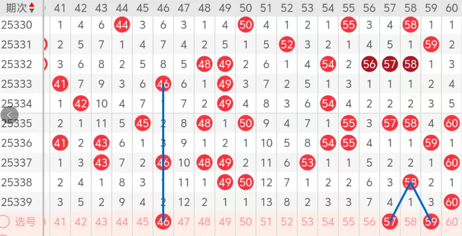 第三区间的走势分析:第三区间上期开出了一个号码球,主要的落号点位在三区间的凤尾处,走出一偶了的形态走势,上期三区间的前半区没有号码球落下,后半区落下了一个号码球,整个三区间处于走冷的趋势,根据三区间的走势规律,今天的三区间我们主看前半区46这个号码球的落位,再看后半区57 59分边码落位,走出了边码和夹码的走势形态,这三个号球建议大家打个三胆拖,或者打个三码复二比较稳妥,重点关注46 57的组合,参考为主!