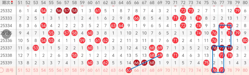 第四区间的走势分析:第四区间上期开出了五个号码球,主要的落号点位在四区间的前半区,走出了两奇三偶的形态走势,上期四区间的前半区落下了四个号码球,后半区落下了一个号码球,整个四区间处于走热的趋势,根据四区间的走势规律,今天的四区间我们主看前半区边码65的落位,也走出了斜连码的走势,再看后半区76 77这个姊妹对号码球的落位,也走出了对称的形态走势,这三个号球建议大家打个三胆拖,或者打个三码复二比较稳妥,参考为主!