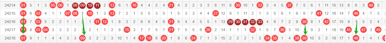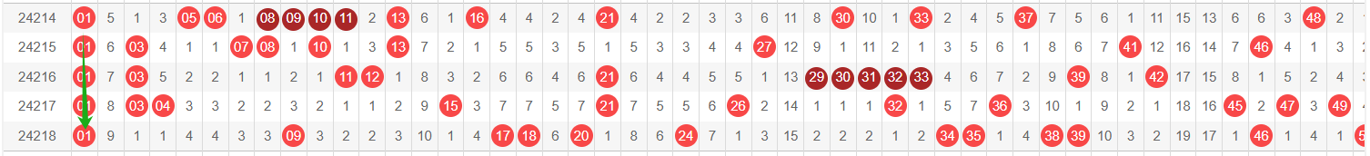 这个条件可以理解为追热号,主要是选取遗漏小于5期的号码来做大底,通过号码分布图我们也能看出,每期都有重复号,都有上期号码的相邻号,再仔细观察下面的部分分布图,2024218期,按照【号码(遗漏)】的方式统计出来是:1(0),9(3),17(7),18(7),20(7),24(5),34(5),........。可以看出遗漏小于5的号码比较常见,这就是一个大概率事件,我们就可以用这个梳理出一部分号码,用来作为我们交集的一组号码。