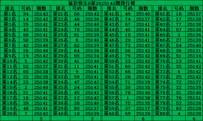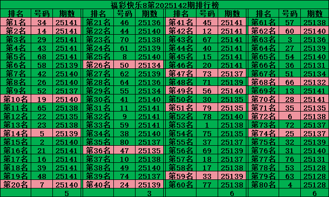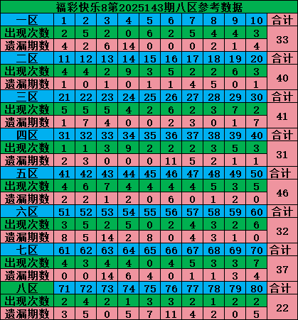 最后再把号码分为五区:一区01-16号、二区17-32号、三区33-48号、四区49-64号、五区65-80号,理论上每个区每期应该开出4个号码,以各区最大遗漏值选择各区号码;2025142期五区比例:5:4:5:3:3
