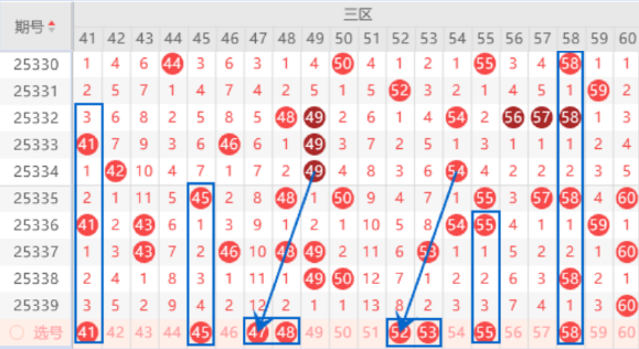 该区间的41号数字是属于323走势,出号机会是有的,本期的45号数字也是有出号机会的,所以本期我们可以防守一下41 45号数字同出的情况。本期的47 52号数字都是属于三斜连号码,本期是有机会出一个号码的,本期可以防守一下47 48号数字或者52 53号数字同出的情况。本期的55号数字出号机会也是有的,本期可以防守一下53 55号数字同出的情况。本期的58号数字是属于1221走势号码,出号机会是有的,我们可以防守一下58 62号数字同出的情况。
