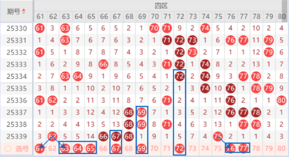 该区间的63 64号数字我们注意一下落下一个号码的情况,其中的63号数字可以重点关注一下出号情况。上期开出了三连号66 67 68号数字,本期我们注意一下出一个重号的情况,其中的67号数字可以重点关注一下出号情况。本期的72 74号数字都是属于重号回补号码,本期是有可能出一个号码的,其中的72号数字可以重点关注一下。本期的76号数字是属于432走势,出号机会也是有的,我们可以关注一下出号情况,本期可以防守一下76 77号数字同出的情况。