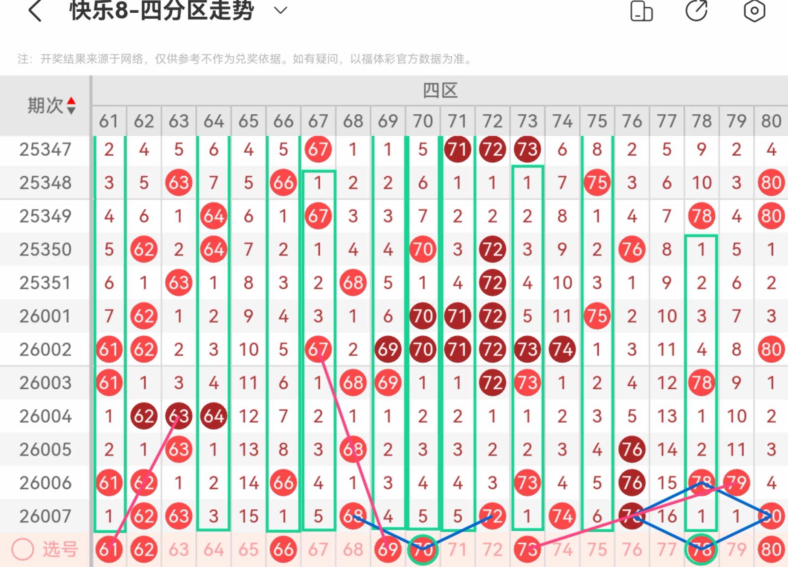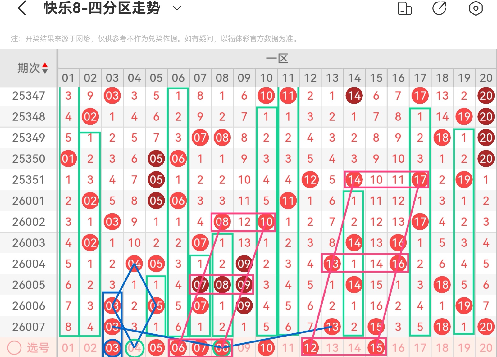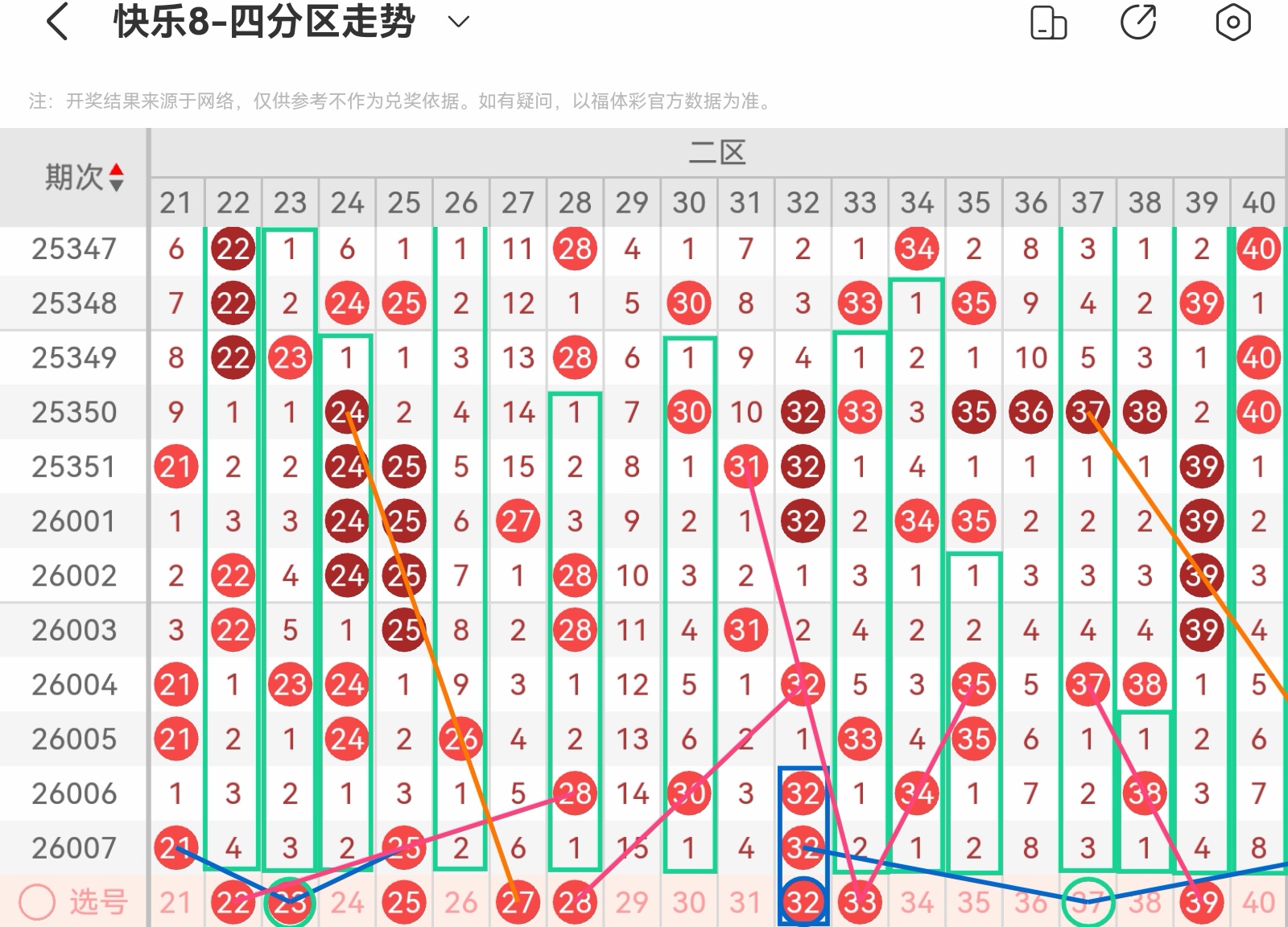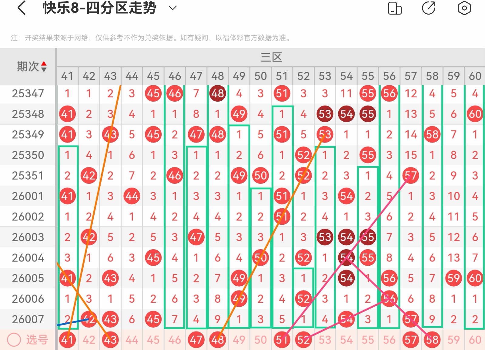 大家好,我是甜丝丝的坏事,主要以快乐八的形态走势、空位走势、遗漏走势以及斜连走势相结合的方法,用公认的四分区走势来进行预测分析,希望能让你有所收获。