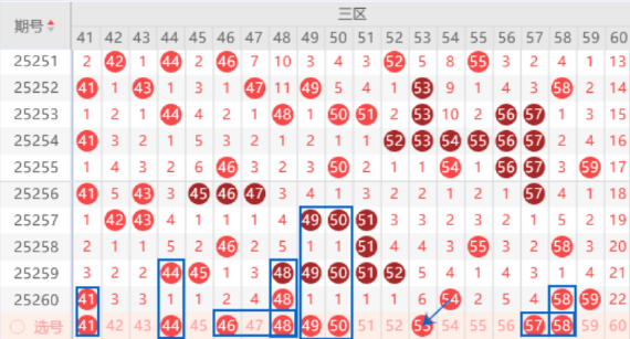 该区间的44 45号数字我们注意一下出一个号码的情况,本期可以防守一下43 44号数字或者45 46号数字同出的情况。本期的46 47号数字我们注意一下出一个号码的情况。本期的48号数字我们防守一下走三重的情况。本期的49 50 51 52号数字都是属于遗漏1期的号码,本期我们要注意落下号码的情况,其中的49 50号数字可以重点关注一下出号情况。上期开出了58 59号数字,本期我们要注意出一个重号的情况。