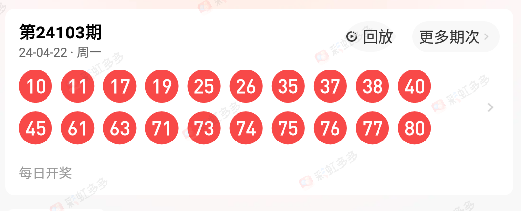 首先看上期回顾,“快乐8”24103期开奖结果: