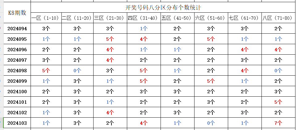 通过分析开奖号码,分享第一个数据分析:统计开奖号码的八分区分布个数,判断各区间的冷热走势。上期开奖号码走势较热的区间:四区、八区,走势较冷的区间:一区、五区、六区、七区。以近10期开奖号码的八分区统计数据为例: