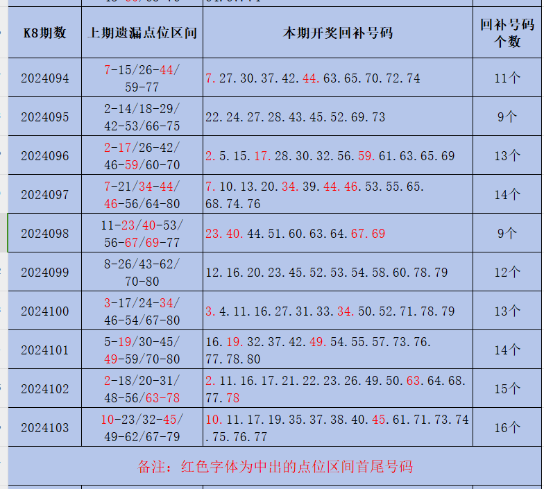 再看第二个数据分析:定位回补点位区间。上期开奖号码和邻号以外的号码,就是遗漏号码,大概率会在下期回补开出。通过定位点位区间,进一步锁定回补号码。以近10期定位回补点位区间的统计数据为例: