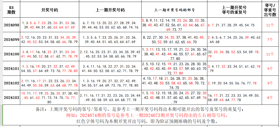 如图,红色字体为上期的邻号、邻重号在下期开出,每期开出10个左右。本期参考邻号:9.12.16.20.24.27.34.41.44.46.60.64.70.78.79;邻重号:10.11.18.25.26.36.37.38.39.62.72.73.74.75.76.77;重点关注:邻重号18.36.39.62.72,可能出胆码。个人分析,仅供参考。