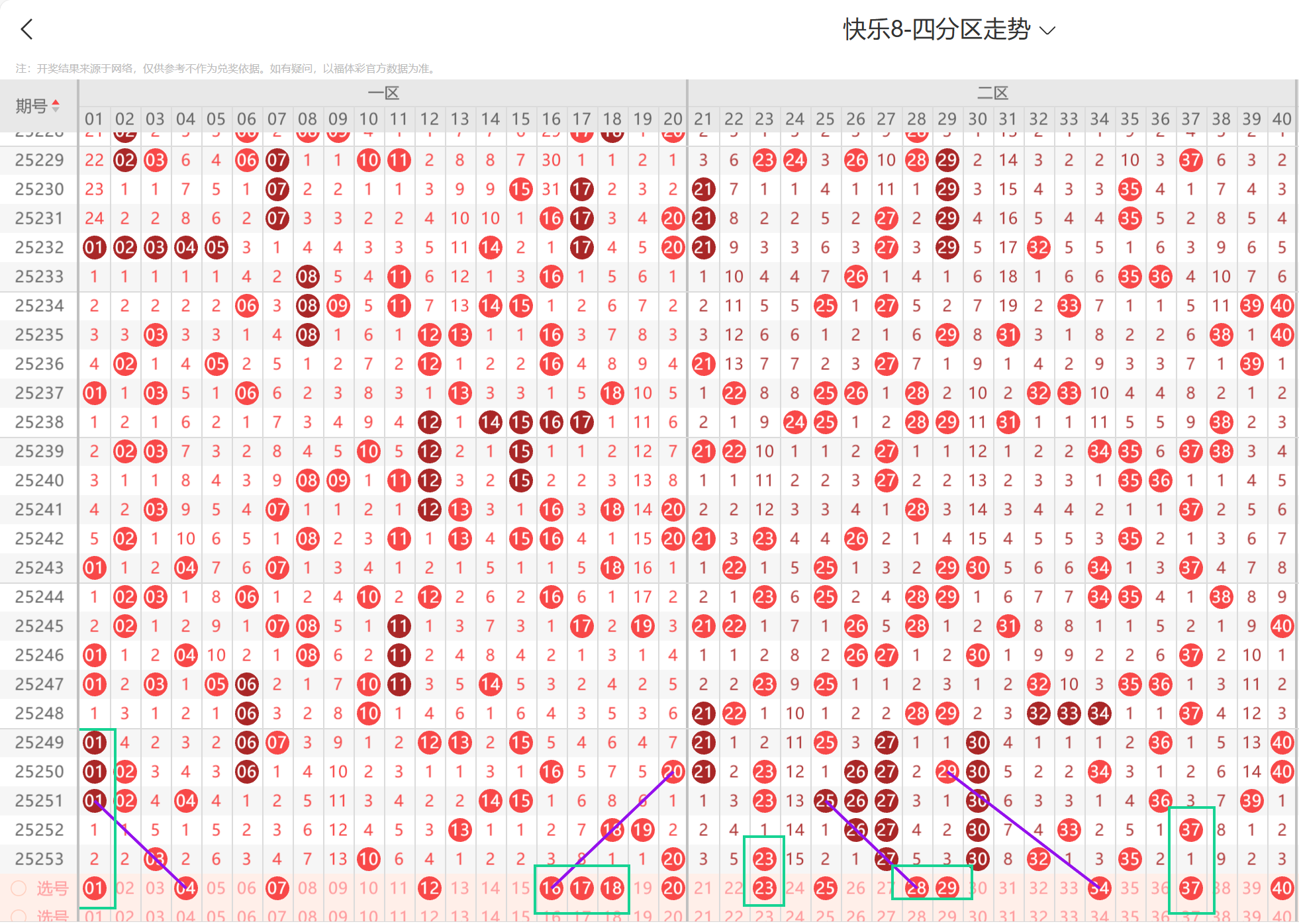 第2025254期福彩快乐8通过以下走势图及一二区间预测分析如下: