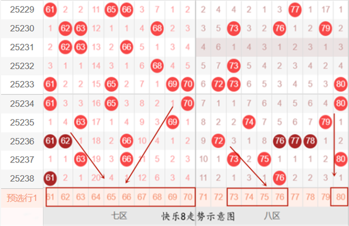 快乐8第25239期:上期重点胆码点位七中五开七码,继续命中主胆,选三中二