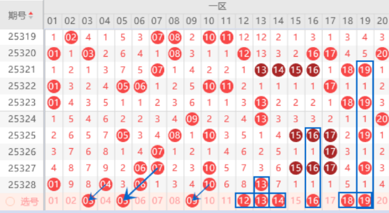 该区间的02 03号数字我们注意一下出一个号码的情况,其中的03号数字可以重点关注一下出号情况。本期的05号数字是属于对应三斜连号码,出号机会也是有的,我们可以防守一下05 09号数字同出的情况。上期开出了13号数字,本期我们注意一下走分边的情况,所以本期的12 14号数字我们要注意出一个号码的情况。三连号15 16 17号数字上期没能开出重号来,本期我们注意一下落下一个号码的情况,其中的16 17号数字可以重点关注一下出一个号码的情况。