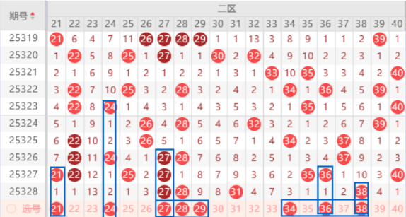 该区间的21 22 23号数字是属于重号22号数字的边号回补号码,本期是有机会出一个号码的,其中的21 22号数字可以重点关注一下出号情况。本期的27 28 29号数字我们注意一下出重号的情况,其中的28号数字可以重点关注一下出号情况,属于阶梯重号,出号机会是比较大的。本期的34号数字我们注意一下出号情况,本期可以防守一下34 36号数字同出的情况。上期遗漏10期的号码都开出了,本期我们要注意一下出重号的情况,所以本期的38号数字我们注意一下出重号的情况。