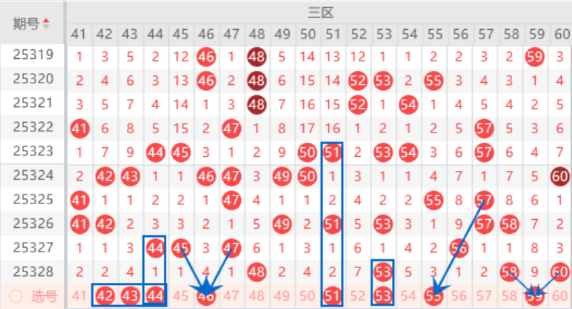该区间的42 43号数字我们注意一下出一个号码的情况期,其中的43号数字可以重点关注一下。连号空一带号44 45 47号数字本期我们注意一下落下一个号码的情况,其中的44 45号数字可以做重点关注一下出号情况。本期的51号数字是属于空二对称号码,本期是有机会出号的,我们可以关注一下。本期的53号数字我们注意一下出重号的情况,本期可以防守一下52 53号数字同出的情况。本期的55号数字是属于三斜连号码,出号机会是有的,我们可以关注一下出号情况。