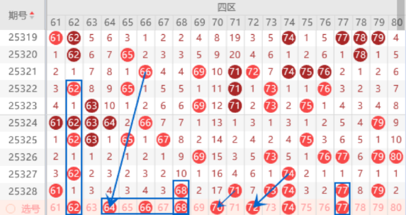 该区间的62号数字我们注意一下出号情况,属于空一对称号码,本期可以防守一下62 64号数字同出的情况。本期的64 65 66号数字是属于交叉对称号码,本期是有机会出一个号码的,其中的64 66号数字可以重点关注一下出号情况。本期的70号数字出号机会也会是有的,属于连带关系号码,本期可以防守一下68 70号数字同出的情况。本期的74号数字我们注意一下走三重的情况,本期的可以防守一下74 75号数字同出的情况。上期开出了77 79号数字,本期我们注意一下出一个重号的情况。