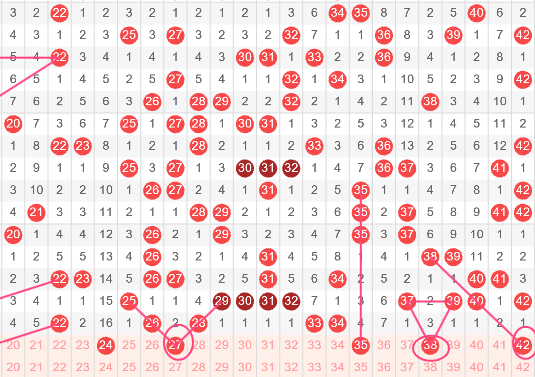 第二区间首先看防守一码冷号24的下落有机会,然后主做一码27号大明码还是机会很大的。尾部看35可防守,38的三角形形态可主做一手,该区间可推荐的选二搭配组合有27 35或者24 42.第二区间胆码主看24 27 38