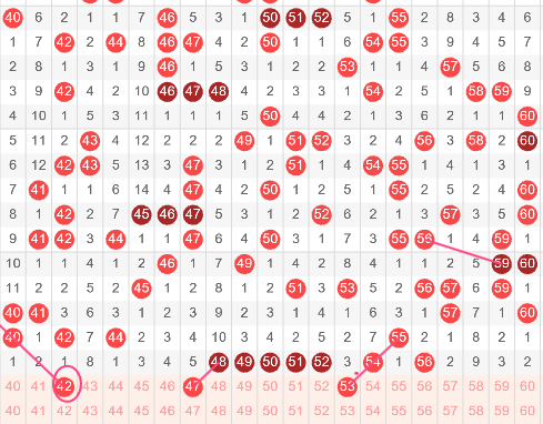 第三区间首先看一码42的回补有机会,然后看上期的五连边码47 53可以二选一做一个或者同出有机会,55的梅花形态想做的可以自己防一下即可,第三区间看的比较简单,该区间可推荐的选二搭配组合有42 47 53.第三区间胆码主看42 47 53