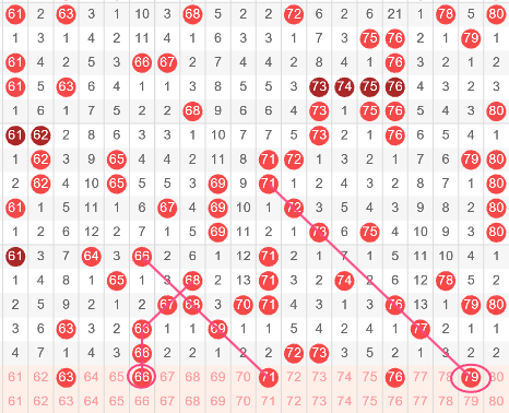 第四区间首先防守一码63的回补有机会,然后主做一码66的三重码下落有机会,在看71的对称形态可以做一手,尾部防守一码76,在看79的123形态很漂亮可以做一手。该区间可推荐的选二搭配组合有66 76或者71 79.第四区间胆码主看66 71 79